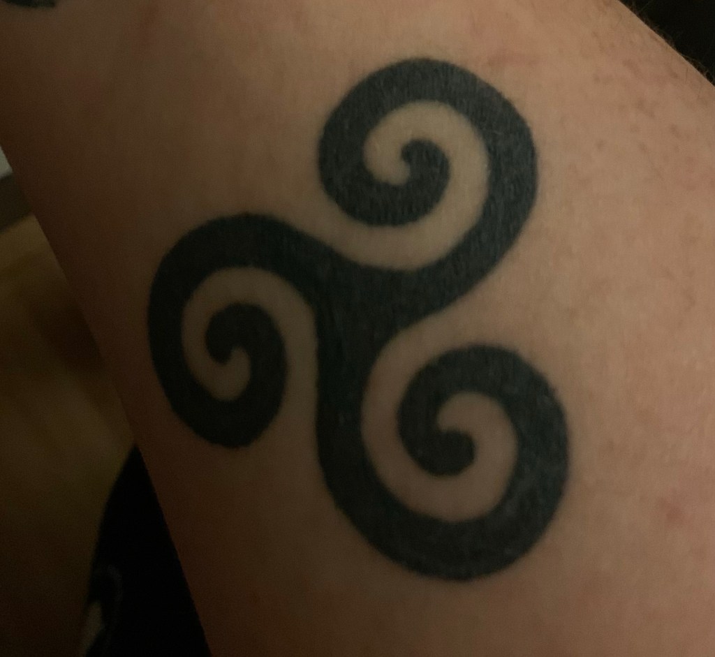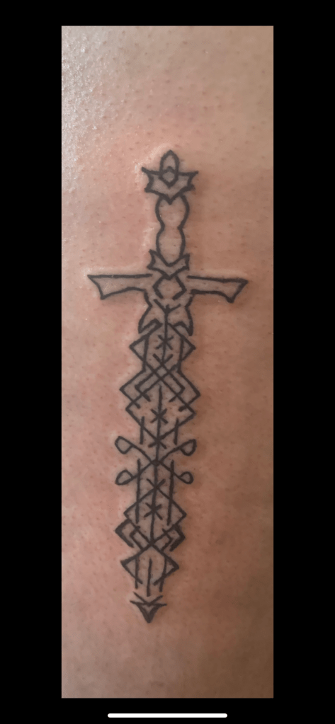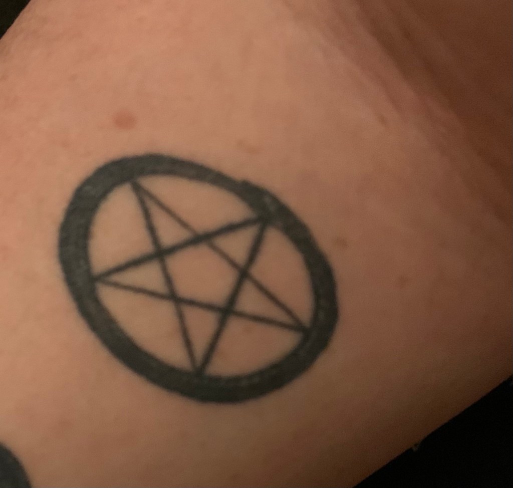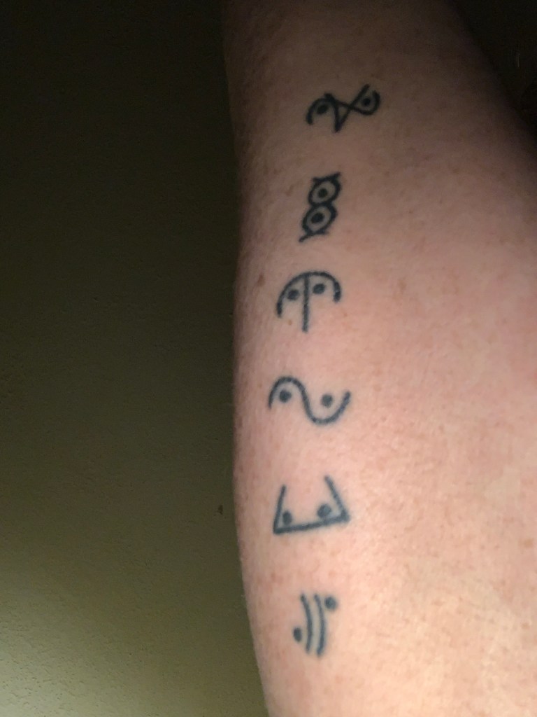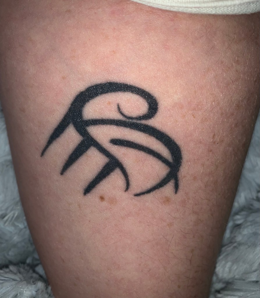 This was the first. I had just surpassed my Mother’s age of death. This is my blood, my Celt roots, my Nan, my Mom, my son and my daughter. This was my mark to celebrate the gift of life. My Ouroboros and Pentacle. My rebirth into my spiritual practice. Something in me felt a deep pull to learn and reconnect to the things that speak to me. This would be more important than I would have ever guessed. ‘Witch Know Thyself’This sigil is a reminder I am stronger than my demons. At this point in my life I had made a kind of peace that anxiety and CPTSD may always be a part of me, but they would not defeat me Next in Moon Glyphs I choose to keep another version of the elements with me. The Pentacle being the other. The two on the top represent balance and life. It was a reminder that I will strive for harmony with in myself and my environment